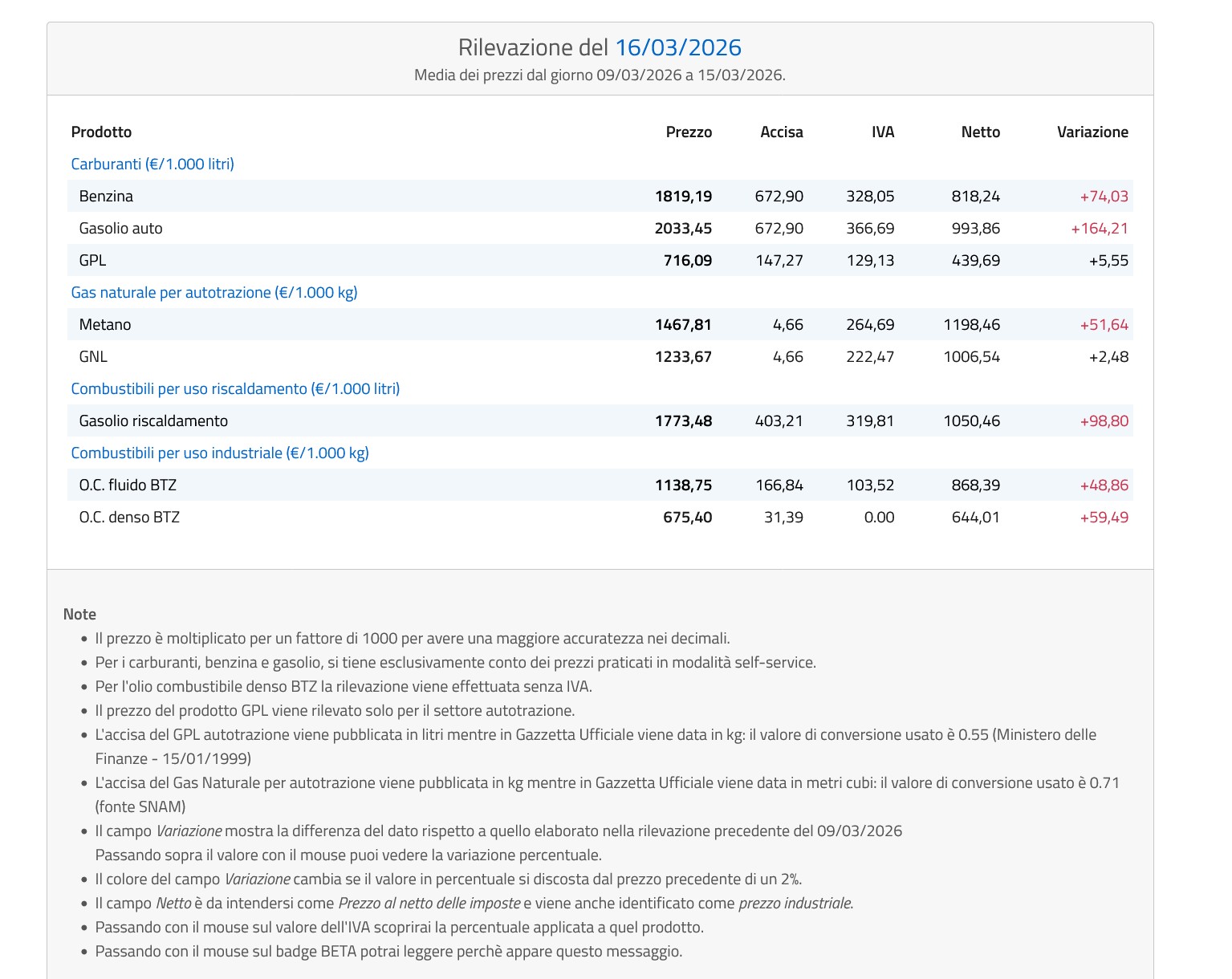 I dati si riferiscono alla media aritmetica – calcolata su base regionale o, nel caso delle province autonome, provinciale – dei prezzi comunicati al Ministero, in attuazione dell’art. 51, comma 1 della legge 23 luglio 2009 n. 99, dagli esercenti l'attività di vendita al pubblico di carburante per autotrazione in impianti situati fuori della rete autostradale.